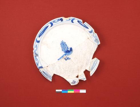 L'assiette est un récipient utilisé pour le service et la consommation des aliments. Celle-ci, peinte de motifs en camaïeu bleu, est ornée d'un oiseau de profil aux ailes repliées surmonté d'une palmette sur son fond. Une bordure à réserves à fleurons et ovales alternés agrémente l'aile. Ce type de décor « à l'oiseau » est inspiré de la porcelaine de Chine et est un motif repris sur la faïence de Delft, de même que sur les faïences d'Angleterre de l'époque. Au cours de son utilisation, cette assiette est cassée et une portion de l'objet est altérée en surface.