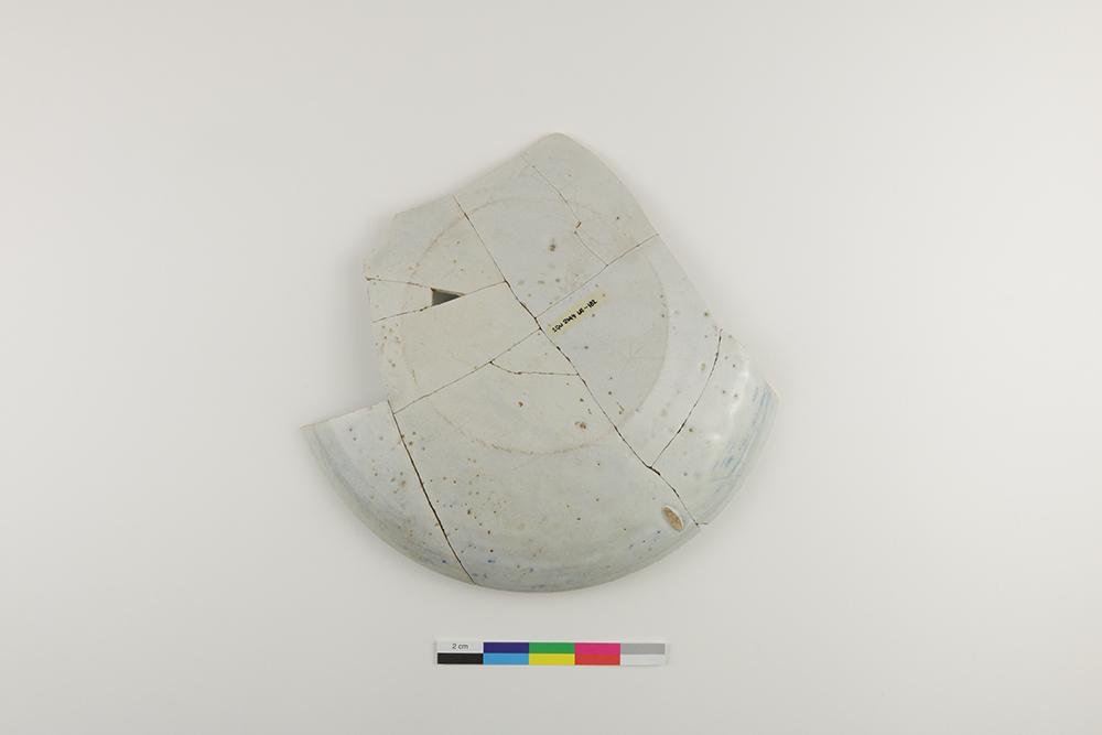 L'assiette en faïence blanche de grand feu est liée au service et à la consommation des aliments. L'objet, fabriqué avant 1750, est incomplet et fragmenté. Son revers comporte une trace de pernette, un support servant de cuisson. L'artéfact est décoré en camaïeu bleu et mesure 23 cm de diamètre et 2,1 cm de hauteur.