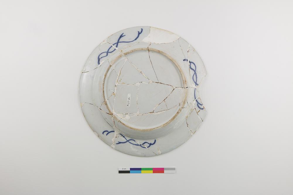 L'assiette en faïence blanche de grand feu est liée au service et à la consommation des aliments. L'objet, fabriqué avant 1770, est complet et fragmenté. L'artéfact est décoré en camaïeu bleu de motifs d'inspiration chinoise et mesure 23 cm de diamètre et 2,5 cm de hauteur.