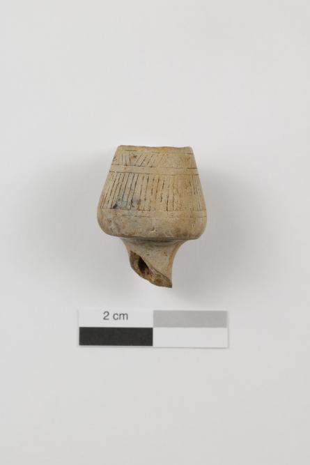 Ce fourneau de pipe à tuyau amovible pourrait dater de la première moitié du XVIIIe siècle. L'objet en pierre de couleur pâle est en forme de gland renversé et porte un décor gravé constitué de lignes verticales ou obliques réparties en trois registres.