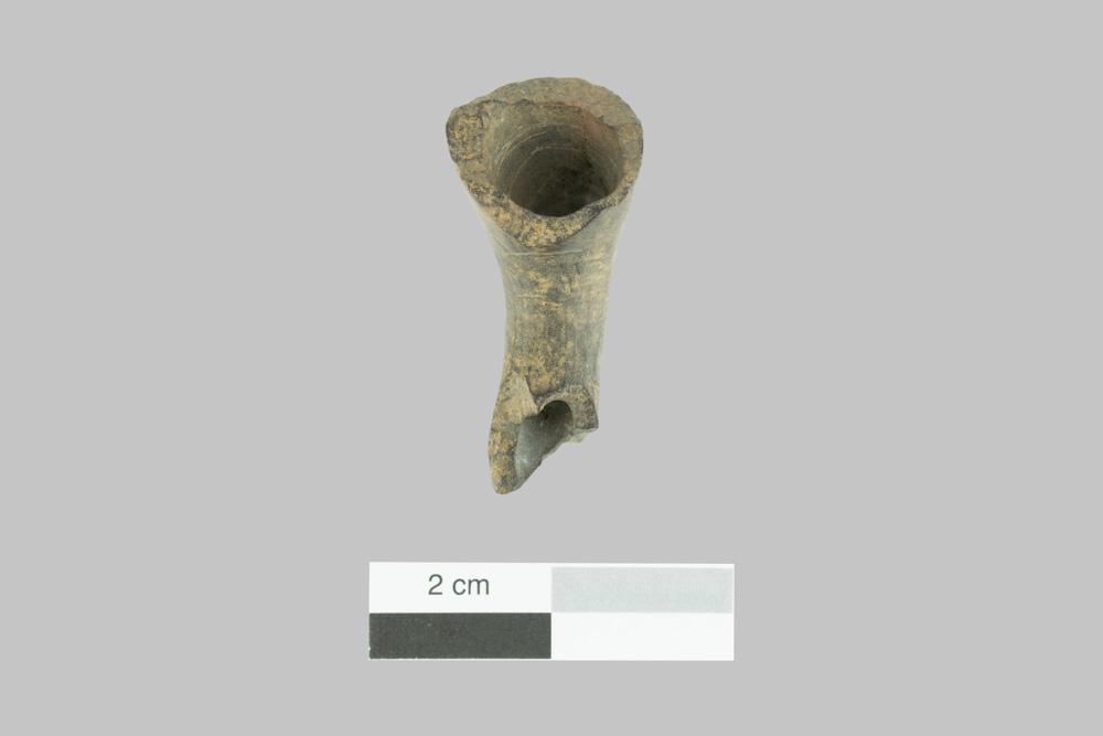 Ce fragment de pipe à tuyau amovible de type coudé à quille pourrait dater du XVIIIe siècle ou de la première moitié du XIXe siècle.
