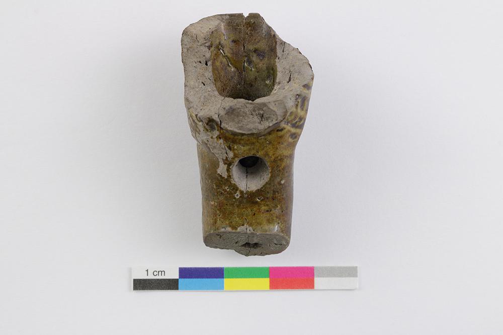 Le fourneau de pipe en terre cuite grossière à pâte grise est lié à la consommation de narcotiques. L'objet, fabriqué entre 1608 et 1680, est muni d'un gros tuyau courbé près de sa mi-longueur. Le fourneau cylindrique saillant de faible capacité et de profil intérieur conique forme un angle obtus avec le tuyau et l'ouverture est oblique par rapport à son axe. L'ensemble de la pipe et l'intérieur de son fourneau sont recouverts d'une glaçure brun verdâtre. Une partie du rebord du fourneau ainsi qu'une section du tuyau et son embout sont manquants. L'artéfact mesure 4,7 cm de longueur et 2,1 cm de hauteur.