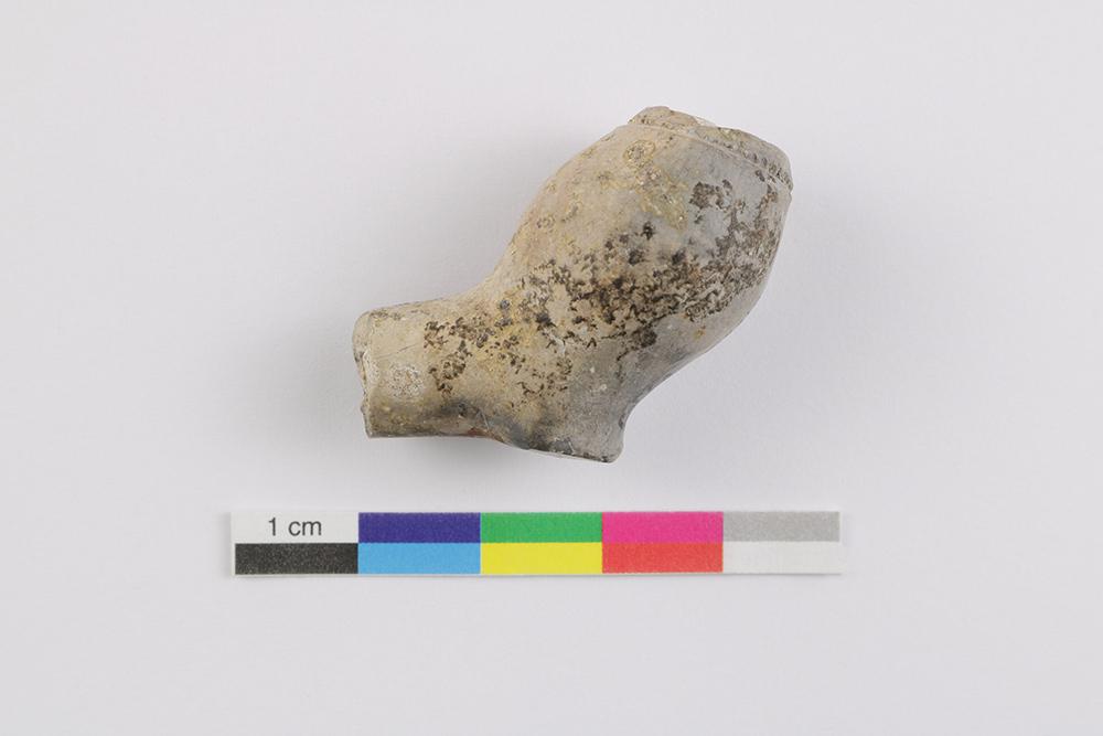 La pipe en terre cuite fine argileuse blanche est liée à la consommation de narcotiques. L'objet, fabriqué au cours de la première moitié du XVIIe siècle, est muni d'une ouverture resserrée et d'un talon accentué plus ou moins plat de section ronde. Le fourneau trapu de faible capacité forme un angle obtus avec le tuyau de la pipe et l'ouverture est oblique par rapport à son axe. L'artéfact mesure 3,3 cm de longueur et le fourneau, 2,2 cm de hauteur et 1,5 cm de diamètre au rebord.