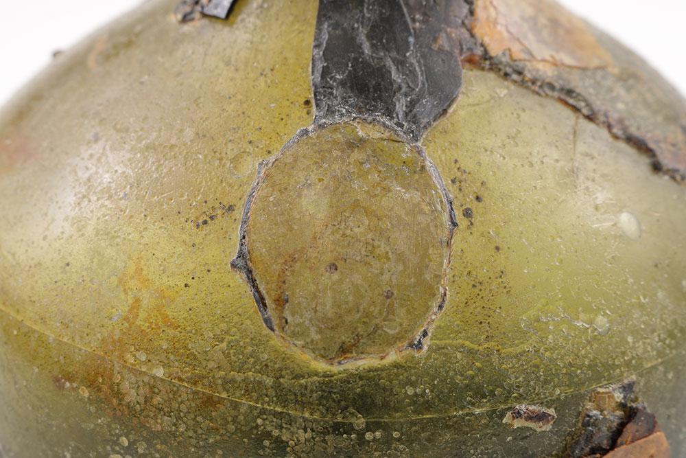 La bouteille à boisson alcoolisée de forme globulaire à col court, fabriquée avant 1690, est un contenant lié à la consommation de boissons alcoolisées. L'objet en verre de couleur vert foncé, fortement altéré par les sels marins, mesure 13,8 cm de hauteur et a un diamètre maximal de 11,7 cm. Un sceau ou une pastille en verre de forme ovale est présente sur l'épaule de la bouteille. La bouteille se compose de plusieurs fragments et elle est presque complète.