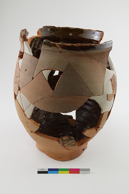 La jarre, fabriquée avant 1690, est un objet lié à l'alimentation. L'objet en terre cuite commune à pâte orangée est incomplet et fragmenté. Son corps, légèrement déformé lors de son façonnage, est globulaire et sa base forme un pied cintré. L'artéfact mesure 24,5 cm de haut, 16,3 cm de diamètre à l'ouverture et 0,6 cm d'épaisseur.
