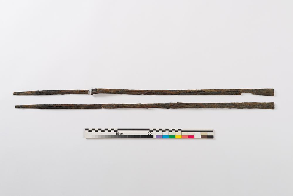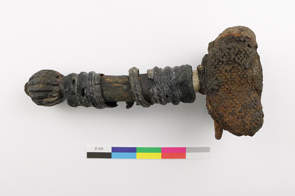 La monture et le fourreau d'épée, fabriqués avant 1690, sont liés à une arme blanche utilisée pour la guerre. D'une longueur de 17,0 cm et d'une largeur de 7,4 cm, la monture d'épée comprend un pommeau en fer cannelé, une fusée en bois filigranée de quillons incomplets et de pas-d'âne ainsi qu'une coquille en fer en forme de « 8 ». La coquille est repliée et décorée de cylindres piquetés en relief. Le fourreau comprend trois fragments en bois, dont le plus long mesure 81,5 cm. Selon la forme de ce fourreau, la lame insérée est très étroite.