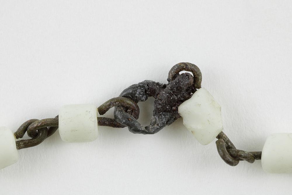 La chaînette se compose de perles de verre blanc opaque montées sur des clous de métal. Les perles de verre de type Ia5 (typologie de Kidd et Kidd de 1972) qui composent cette chaînette sont fabriquées en Europe par étirement. La technique de l'étirement nécessite la présence de deux personnes. Une première personne prend une bulle de verre à l'aide d'une canne munie d'un trou en son milieu. La bulle est soufflée et elle peut être trempée dans du verre fondu pour augmenter son volume ou pour lui ajouter d'autres couleurs. Une deuxième personne met une tige de fer à l'autre extrémité et les deux personnes tirent dans des directions opposées jusqu'à ce que le verre soit à la largeur voulue. Il est possible de torsader le tube de verre pendant l'étirement pour créer un motif. Le tube est ensuite laissé à refroidir totalement avant d'être coupé en plusieurs morceaux pour obtenir des perles.