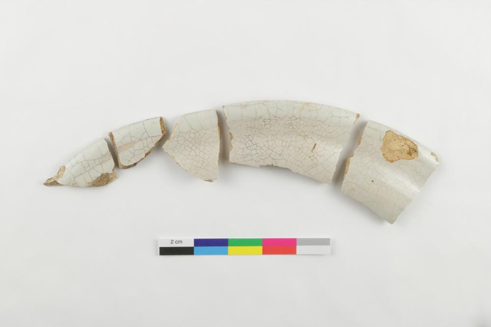 L'assiette est un contenant lié à l'alimentation fabriqué entre 1725 et 1760. L'objet en faïence blanche est incomplet, il ne reste qu'une portion du rebord et du marli. Le plus gros des cinq fragments de cet artéfact mesure 8,0 cm de longueur, 4,5 cm de largeur et 0,5 cm d'épaisseur.