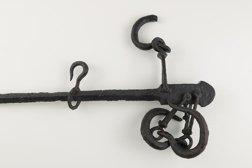 La balance à poids curseur, fabriquée avant 1690, est un équipement de science et technologie lié au commerce. Elle est formée d'une tige de fer forgé à section carrée se terminant par un disque plat. Quatre crochets sont fixés à cette tige. La balance à poids curseur mesure 52 cm de longueur et 21 cm de hauteur.