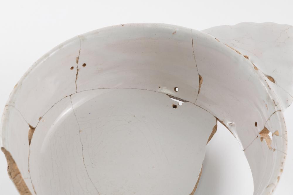 L'écuelle est un récipient en faïence blanche de grand feu utilisé pour la consommation des aliments chauds. L'objet, fabriqué dans le deuxième tiers du XVIIIe siècle, est incomplet, fragmenté et dépourvu de décor. Des trous de réparation au niveau de la paroi de l'écuelle indiquent que cette pièce a été restaurée. L'une des oreilles est fixée au bord supérieur, alors que l'autre est manquante.