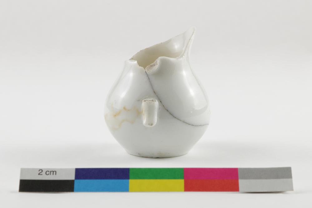 Le pot à bec verseur jouet est fabriqué en Europe au courant du XIXe siècle, comme en témoigne le type de porcelaine utilisé pour produire cet objet, qui est typique de cette période. Bien que rien ne permette d'attribuer la fabrication de ce bain à un lieu précis, il est connu que l'Angleterre, l'Allemagne et la France produisent ce genre d'objets miniatures en porcelaine européenne fine et dure. Incomplet, le pot à bec verseur présente un corps globulaire, une anse verticale fragmentaire, un large bec ainsi qu'un fond plat. La porcelaine est recouverte d'une glaçure.