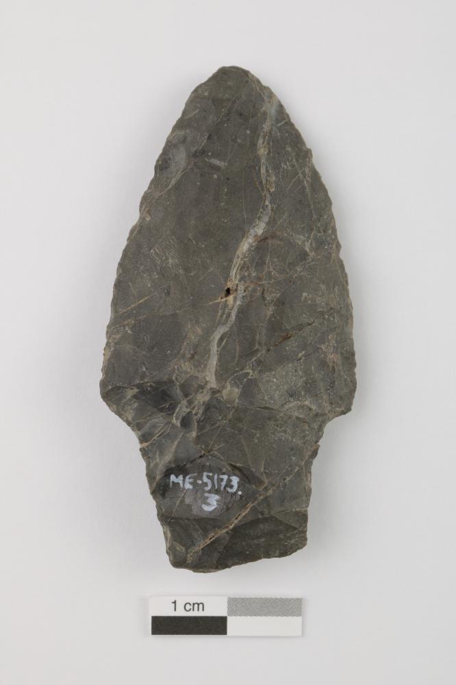 La pointe triangulaire à pédoncule est associée au Sylvicole inférieur (3 000 à 2 400 ans avant aujourd'hui). L'objet entier, taillé de manière bifaciale, présente une surface recouverte de négatifs d'enlèvements. La pointe est de forme triangulaire et présente des bords légèrement convexes. Le pédoncule de la pointe prend la forme d'un trapèze, ses bords convergeant légèrement vers la partie proximale. La pointe triangulaire est asymétrique : en traçant une ligne du sommet à la base, il est possible de voir que la lame est plus large sur l'un de ses côtés. Les épaules présentent également un angle légèrement asymétrique, formant un angle plus aigu d'un côté et plus obtus de l'autre. La pointe de type « Adena » est en chert de couleur verdâtre, dont la provenance est encore inconnue.