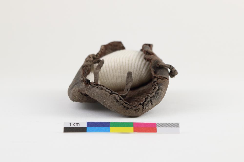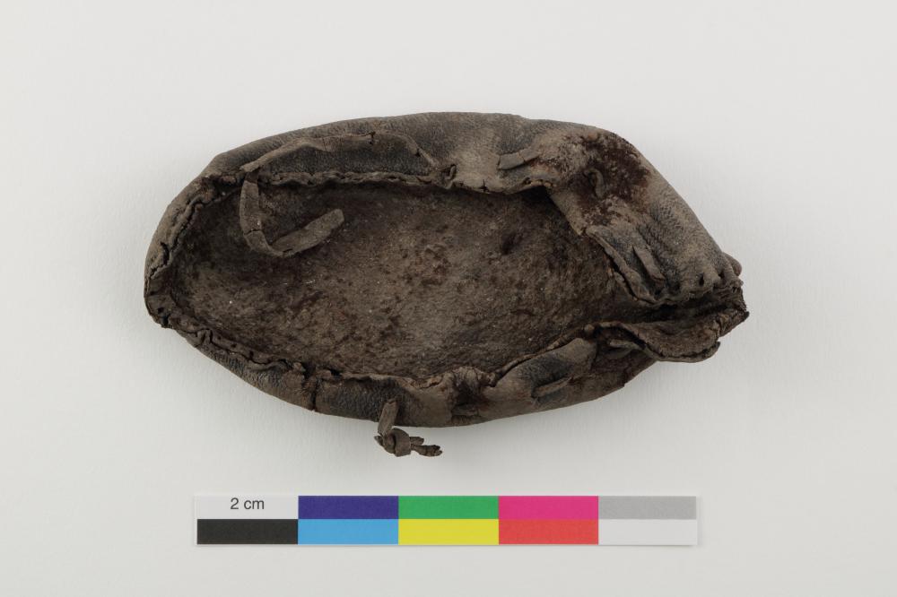 Mocassin d'enfant. Boîte de conservation contenant le mocassin restauré et d'autres pièces en cuir provenant du Village des Tanneries.