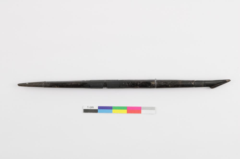 L'outil en os fabriqué et utilisé par les Iroquoiens du Saint-Laurent au cours du Sylvicole supérieur (1 000 à 450 ans avant aujourd'hui) forme une longue tige à surface polie et noircie, aux extrémités pointues. Il porte une petite crête arrondie près de l'une des extrémités et sa section transversale est circulaire. Deux fines incisions parallèles font le tour de la pièce près de la crête. Cet outil poli et noirci a probablement servi de broche à cheveux, comme le laisse supposer sa dimension, son poli et la présence d'une petite crête arrondie sur l'une des extrémités. Sa fonction précise demeure toutefois indéterminée. Les archéologues avancent néanmoins plusieurs hypothèses. Outre la broche à cheveux, l'outil aurait également pu servir d'élément de foëne. L'outil aurait aussi pu servir de grande épingle pour attacher un vêtement.