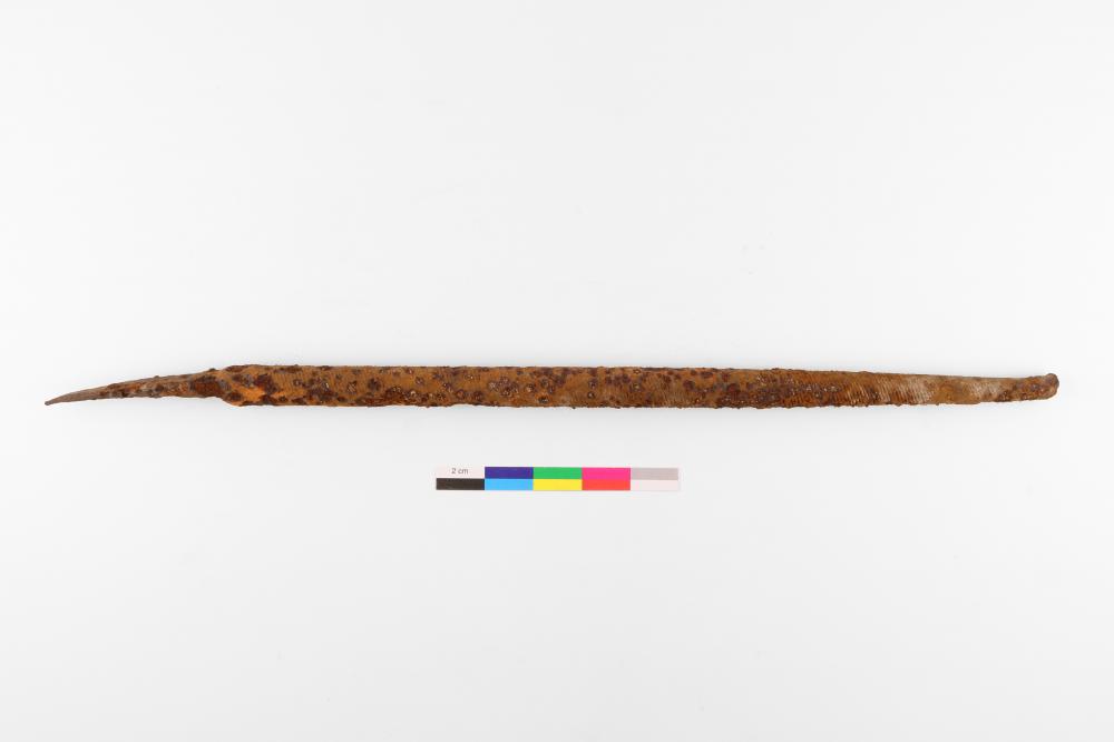 Les limes sont un outil usuel du métier de forgeron. Elles sont utilisées pour effectuer l'enlèvement contrôlé de métal sur une pièce métallique par frottement afin de l'ajuster ou de procéder à sa finition. Il existe plusieurs variations de cet outil afin de répondre aux besoins et aux préférences des artisans dans l'accomplissement de leurs tâches et de leurs gestes, mais en général, elles sont composées d'une soie permettant l'emmanchement de l'outil et d'une tige de forme variée travaillant le métal. Dans le cas de cette lime-ci, la tige est longue, circulaire et est plus effilée à la pointe du corps qu'à la queue. Elle est idéale pour travailler des pièces présentant des courbes concaves ou encore pour limer l'intérieur d'une ouverture circulaire, semi-circulaire ou autre selon les besoins de l'artisan. Possiblement en raison de son séjour dans le sol, l'objet est durement affecté par la corrosion.