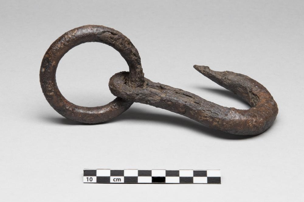 Le crochet est un élément de retenue ayant une extrémité recourbée. Celui-ci pourrait être attaché à une corde ou une chaîne ou bien être inséré dans un moraillon ou un autre oeil afin d'accrocher des éléments entre eux. Il est possible que ce crochet ait servi d'allonge.
