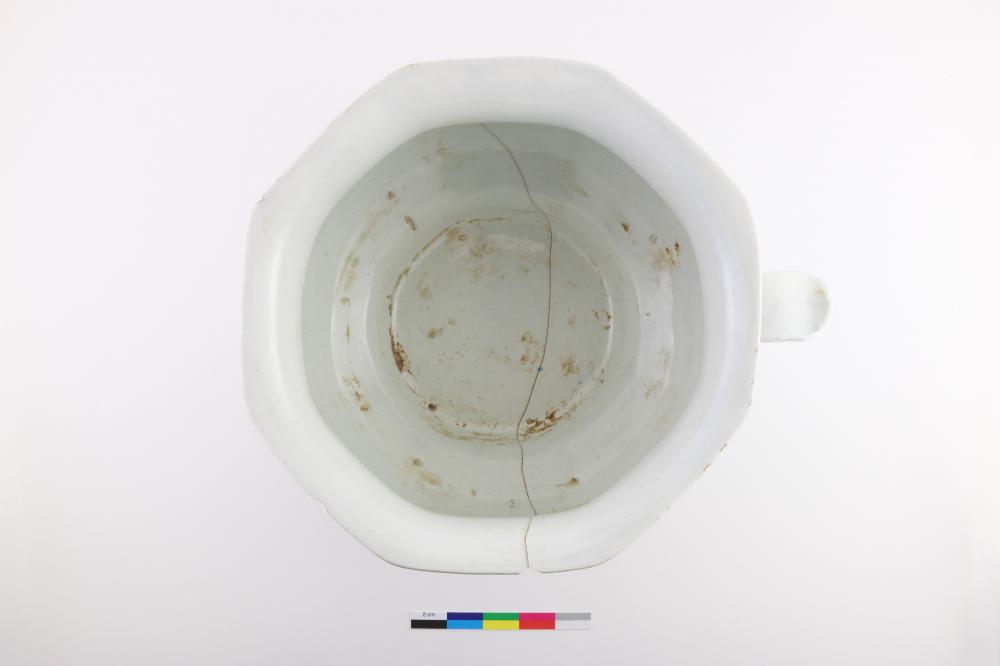 Le pot de chambre est un récipient lié à l'hygiène personnelle datant de la deuxième moitié du XIXe siècle. Entier, le pot en terre cuite fine vitrifiée est de forme octogonale de style gothique à panneaux. Il est doté d'un piédestal et d'une anse arrondie. L'objet mesure 13 cm de hauteur, avec un diamètre de 15 cm au niveau de la base et de 20 cm au niveau de l'ouverture.