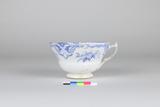 La tasse est un objet lié à l'alimentation utilisé lors de la consommation de boissons chaudes datant du deuxième quart du XIXe siècle. Complète, la tasse circulaire en terre cuite fine blanche possède un rebord droit, une paroi à double courbe et un piédouche. L'anse est verticale et simple. La tasse est ornée d'un décor imprimé bleu pâle à motif romantique en son centre et d'un motif floral sur la bordure extérieure. L'objet a un diamètre de 11 cm et une hauteur de 6,3 cm.